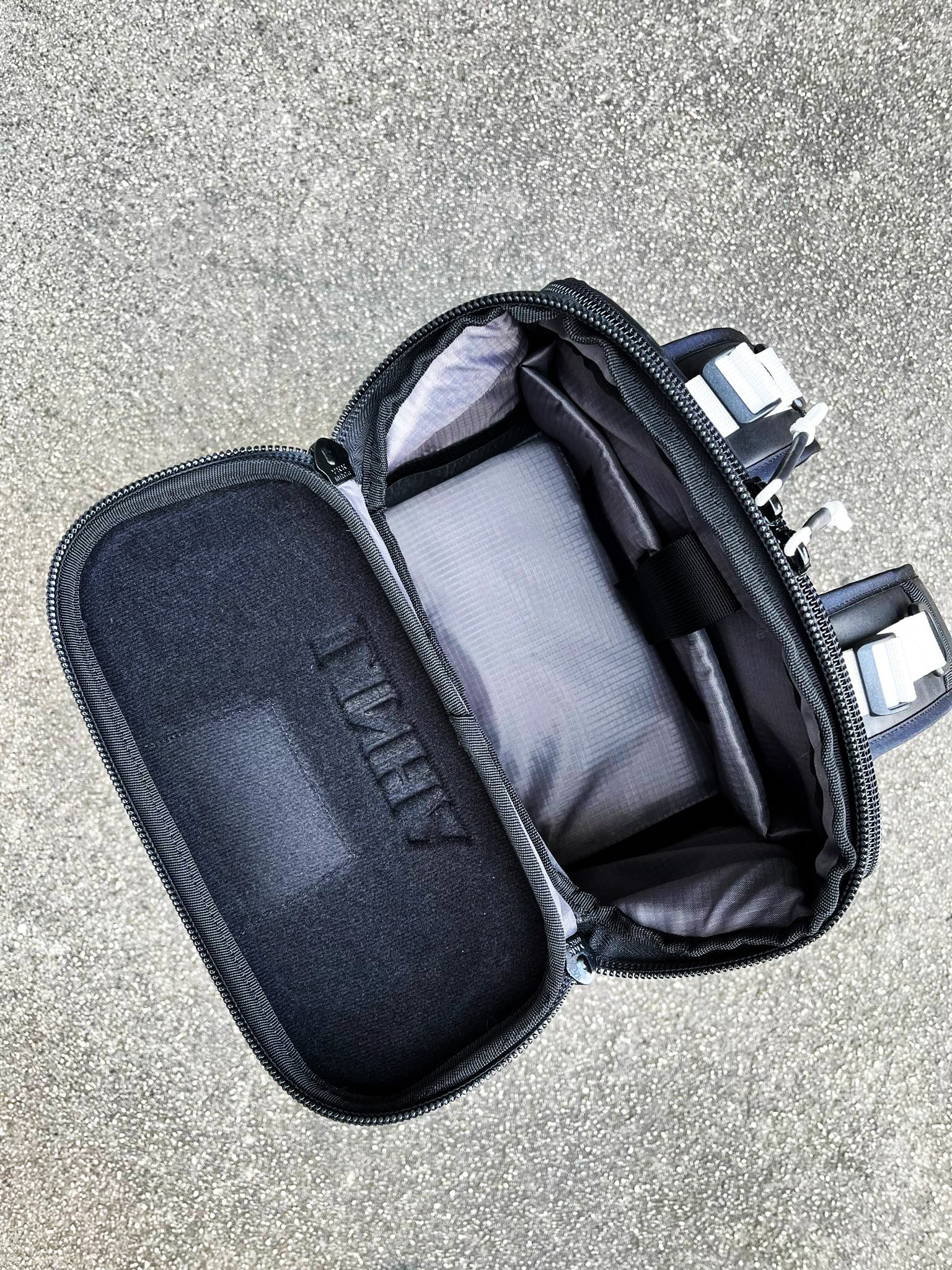 外側のボディは500dナイロンTPU(防水生地)とフロントポケットは生地を逆にした