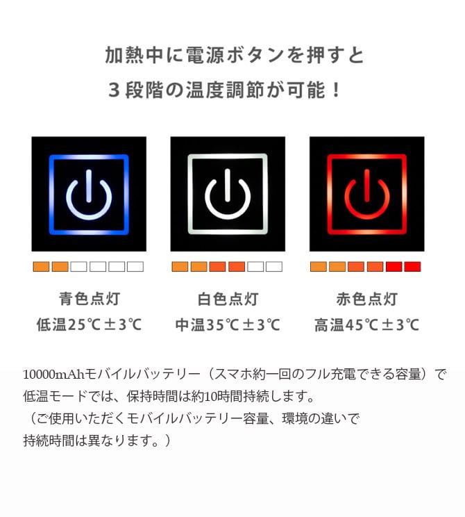 電熱は3段階の温度調整が可能です。